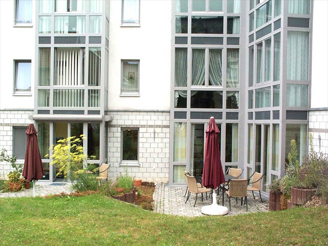 Die geräumige Gemeinschaftsterrasse lädt an sonnigen Tagen zum Kaffetrinken und kurzweiligen Unterhaltungen ein.