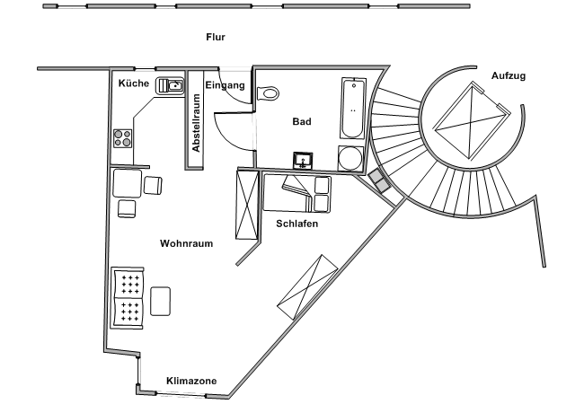 Einen Überblick über die Raumaufteilung der Wohnung im ersten Obergeschoß zeigt die untenstehende, schematische Zeichnung. Die gesamte Wohnanlage ist behindertengerecht ausgestattet. Die Wohnung ist gut über das nahe gelegene Treppenhaus und den geräumigen Aufzug erreichbar. Sowohl der Flur, als auch die Wohnung selbst, verfügen über eine Vielzahl Fenster. Das Badezimmer ist geräumig und verfügt über eine behindertengerechte Ausstattung. Dazu zählt eine Dusche, die mit einem Rollstuhl aufgesucht werden kann. In der eigenen Küche können kulinarische Köstlichkeiten selber gezaubert werden, andernfalls ist die Einnahme der Mahlzeiten im gegenüberliegenden Altenheim oder eine Versorgung durch „Essen auf Rädern” möglich.